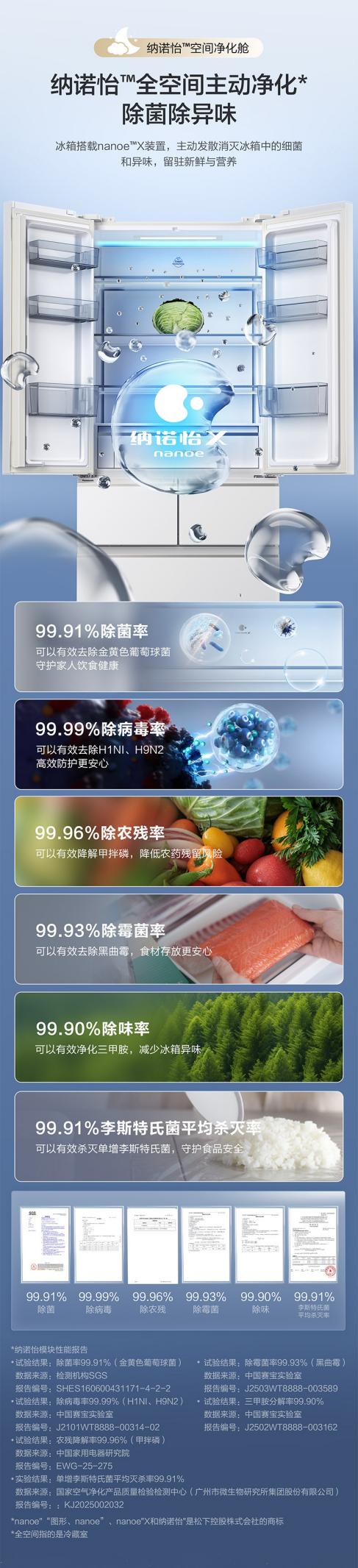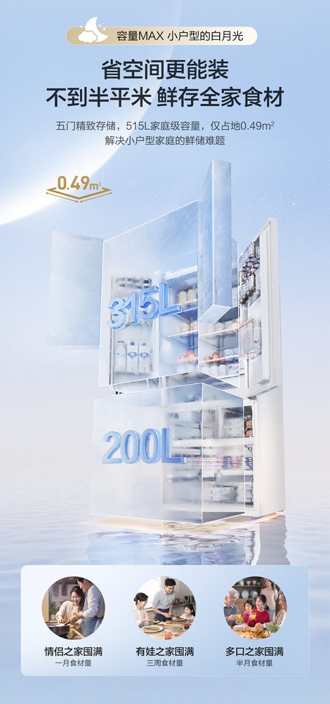 在全功能配置上,五门款完全延续了白月光2.0的核心优势,配纳诺怡X主动除菌技术,可主动分解全域细菌与异味分子,除菌率达99%以上,即便将榴莲、洋葱等重口食材与甜点、水果同放,也能保持各自本味,比1.0版本的被动抑菌更彻底,完美适配大家庭食材混放的场景。