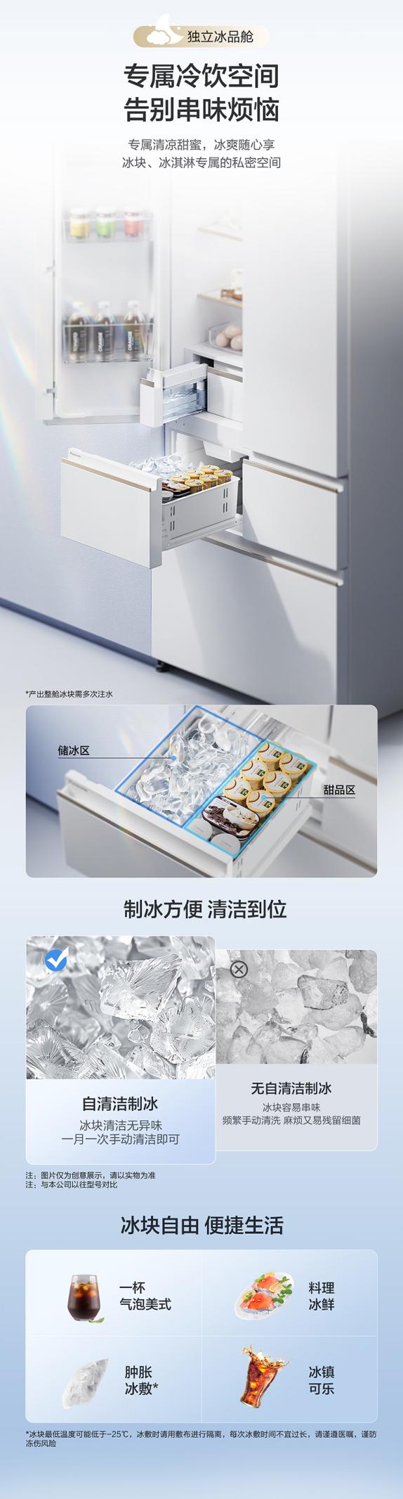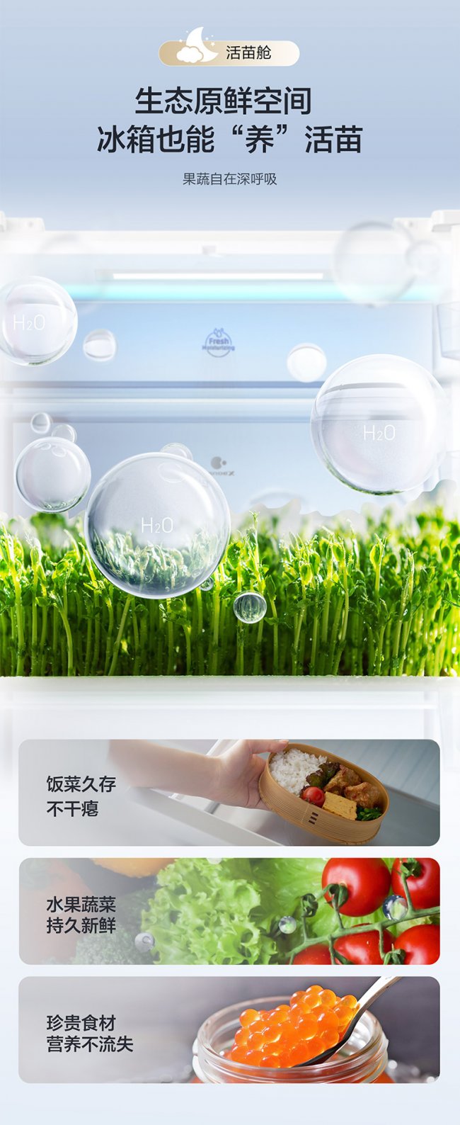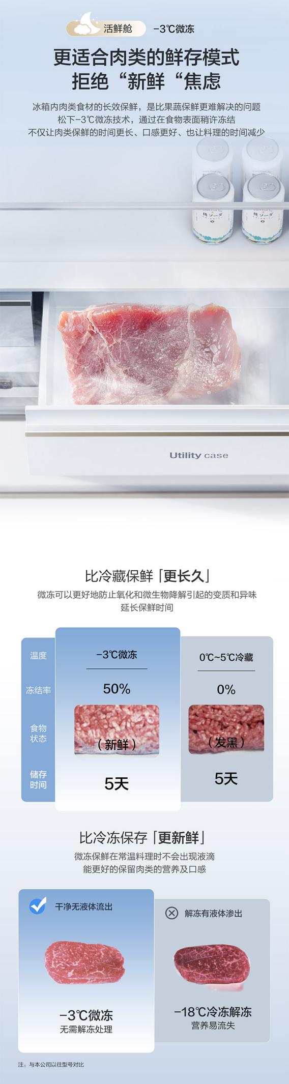 水润养鲜功能将冷藏室湿度精准稳定在50%,全家一周所需的菠菜、青菜、草莓、葡萄等果蔬,存放后仍能保持鲜嫩多汁,减少食材浪费;冷藏室-3℃微冻抽屉可存放日常食用的肉类,存放一周后取出仍能直接切配,无需提前解冻,节省备餐时间,尤其适合大家庭多人就餐、备餐量大的场景。顶置压缩机设计释放了底部空间,使冷冻主舱深度达35cm,可轻松容纳整只家禽、半只羊腿,或批量冻品、速冻食品,满足大家庭节日囤货、日常储备的需求,再也不用担心冷冻空间不足的问题。